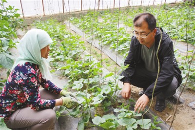 王生兵(右)在温室大棚内向农户了解农作物生长情况。资料照片