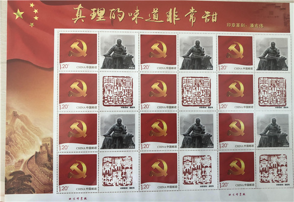 日前,篆刻家潘宏伟以《共产党宣言》为主题,篆刻了《真理的味道非常甜》印章,被复旦大学《共产党宣言》展示馆收藏,印章还登上了陈望道个性化邮票,陈望道之子陈振新教授在邮集上签名。其篆刻的伟大的抗疫精神《生命至上,举国同心,舍生忘死,尊重科学,命运与共》印章亦受到收藏人民英雄陈薇纪念封的邮迷追捧,用于盖印留念。