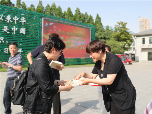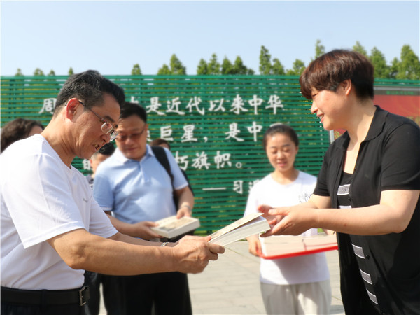接着,在纪念馆正门口,徐苏宾带领该市十一届人大常委会副秘书长、办公厅主任冯俊,市十一届人大常委会副秘书长、研究室主任张勇,市十一届人大常委会副秘书长、人事代表工委主任陈利卿,下城区十三届人大常委会主任朱钟毅,拱墅区第六届人大常委会主任洪永跃,西湖区十四届人大常委会主任施增富,市人大常委会办公厅原副主任、研究会副秘书长彭启政,拱墅区第六届人大常委会副主任来鸣,余杭区十四届人大常委会副主任王云联,下城区人大常委会城建环保工委原主任杜荣华,余杭区人大常委会法制内司工委原调研员仰健雄,桐庐县人大常委会城建环保工委原主任姜春龙,下城区人大常委会办公室原主任王炳华,市人大常委会办公厅行政接待处调研员范青江,市人大工作研究会办公室副主任刘瑜坤等,应群带领蔡峦、江敏、胡建丽等,依序举行了《下关史话》赠书环节。(供稿:江敏 王爱兵)