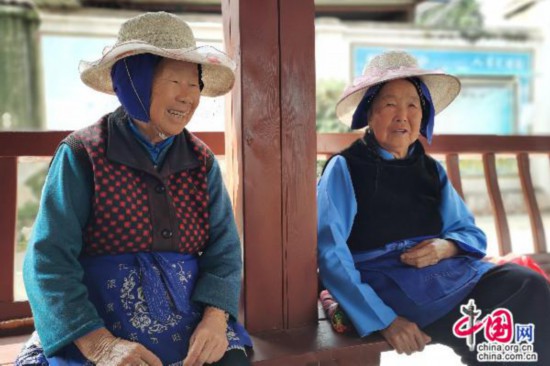 在七步场社区,两位80多岁的老人在长廊里聊天