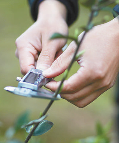 23日,科技人员在贵州省铜仁市玉屏侗族自治县的油茶育苗基地测量油茶苗生长直径。