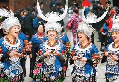 贵州的苗寨姑娘们向游客敬拦门酒。蔡兴文摄