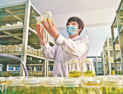 技术人员在张北县德胜村无菌育种室内察看马铃薯瓶苗长势。摄于2020年5月。