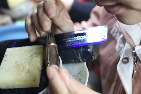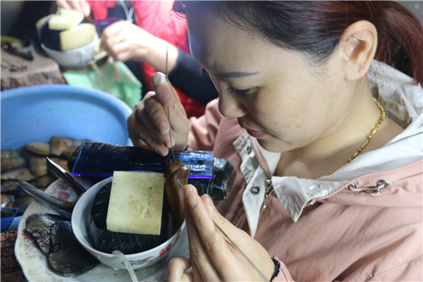 据张根芳教授介绍,“插片”操作工的大量产生,是伴随育珠技术的普及,并随着农村联产承包责任制的推行,珍珠养殖在长江中下游地区广泛开展之后,在上世纪80年代,从江苏传到浙江的诸暨、金华、武义、兰溪,以及湖南、安徽等地。以前基本只有无核珍珠“插片”技术,随着市场的需要,现在已经有了有核珍珠“插核”技术,形成的珍珠除了圆形外,还有钮扣形、梅花形、十字架等不同的形状。目前在金华从事无核珍珠“插片”的基本是安徽、湖南一带的师傅,而从事有核珍珠“插核”的多数是江西师傅。(王东方)