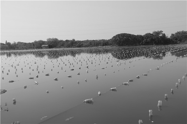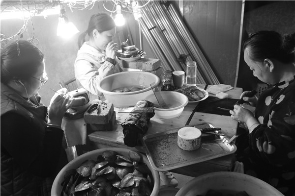 相比较而言,虽然“插片”的收入较高,但也很辛苦。“插片”的季节很多是在大热天,坐在简易大棚下的“插片”场一会儿就汗流夹背,腰背要挺直,双眼紧盯一条仅开出一条缝的蚌口,用双针把一小块一小块的小片插入蚌中,又要保证蚌的存活率。因为人多,老板提供不了那么多的房间,晚上睡觉都是铺了稻草打通铺,男男女女就睡在一个房间里,蚊子又多……。