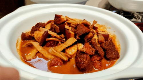 有这么多美味,不免多喝了几杯酒。从包厢里出来,看到每桌的菜都是“光盘”,看来菜肴很合游客的口味。陈军委介绍,他这里可以150多人共同就餐,“移动酒席”酒家也还在做,前几天,一餐就烧了50桌。(王东方)
