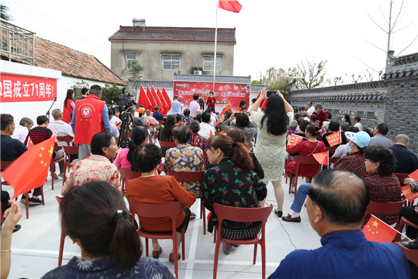 9月28日下午,在淮安区淮城街道楼东社区新落成的文体活动广场红旗招展、歌声飞扬。社区党群志愿者及居民们正在这里欢聚一堂,开展“迎中秋、庆国庆”文艺汇演活动。