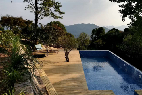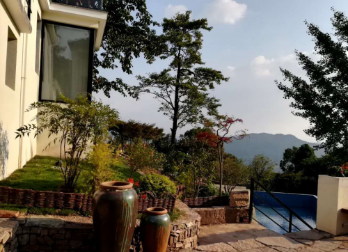的镶嵌于古老山村的新型业态。这个民宿没有摒弃古陈、田园的元素,而是巧妙的与现代功能、设施融合。庭院中湛蓝水面的露天泳池有现代的洁水、换水功能,池水的深浅符合不同群体的要求。泳池与海滩浴场、室内泳池以及传统的露天泳池有天然的区别,它与精耕细作的菜园为邻,参天的香樟、红枫、柿子树的冠能遮风挡雨,遮阳避日,是天然的大伞;散漫任性的山溪由上而下,依山势呼啸着狂奔,如脱缰的野马,然流入庭院后须臾变得淑女起来,她依循屋主人设定的路线,缓步迂回在房前屋后,院落之中,她长长的“裙摆”下,一群锦鲤簇拥着尾随、追逐;曲径通幽的小路由古朴的青石板和陈旧瓦砾铺出,低矮的围墙也多是民国时代的旧料砌筑,漫步其中,脑海里不免出现尘封的文字,不由自己地会想起久远的故事;中秋圆月高挂,庭院里的灯光闪烁起来,从灯笼式的玻璃灯罩中透出的光线柔和而温暖,有如烛光仰起了小脑袋,与向下俯视的月光窃窃私语;大浴盆中的水