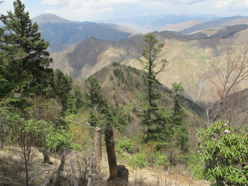 藏地的山势都很陡,大都在四十五度角以上。林中也很难觅见由人走出来的小路,我们基本上是延着溜木头的滑道,手脚并用往上爬。茂密的松林下面,沉积着厚厚的松毛丝以及腐枝烂叶,踩在脚下如羊毛地毯般柔软。我时常想,这要是在老家东山的茅坪里有多好,背到家就能烧火。远处和近处,被人丢弃的巨大的松树脑袋,像一顶顶降落伞,散落在密林的空隙处,有些枝干已酥软、腐烂。有些已经干透了,撅一下,嘎嘣嘎嘣脆。还有些松毛丝仍然是碧绿的,枝干的刀口处流淌的田黄般松油,凝成了一个个疙瘩,散发出的阵阵松香,让人心旷神怡,那是刚刚砍伐后丢下的。我又想,这要是在老家东山的对头山上,或者长坑山上有多好,这么多上好的硬柴,就是跑到四明山里的商量岗,也是很不容易捡到的啊。