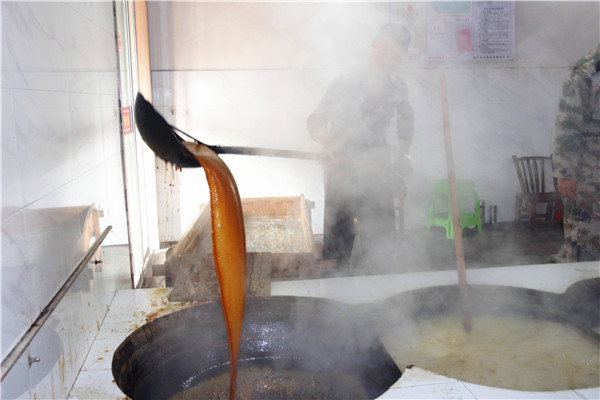 一捆捆糖梗码得整整齐齐地堆放着,工作人员正忙着将一根根糖梗喂进榨汁机的“大嘴里”,略带青色的糖水哗哗地从另一个口子流进“糖水池”里。通过水管,糖水流到隔壁的蓄水罐里,等候下锅“煎熬”。一到点,榨糖师傅水龙头一开,糖水直接流进大灶。经过过滤,汁水依次在5个大锅中一步步浓缩,浓稠到一定稠度后,红糖汁便转入长方形木制容器内降温。再经过10多分钟的推、铲、压、磨等,红糖新鲜出炉,整个流程,榨糖师傅行云流水。