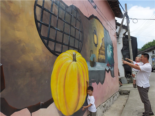 清澈的山水从墙上“流出”,仿佛伸手便可接一把水洗脸;一头耕牛,一只脚“踏墙”而出;一个金黄的大南瓜,让人想随手从墙上“捧”下来,煮一锅,美美地吃一餐……观者不用佩戴眼镜或其它辅助工具,只需静观画面即可看到这些活灵活现生动如真的立体效果。这几年,除了在大莱村,清溪口水库公园、千丈岩、白革村等地都留下了李俊飞所画的3D油画。