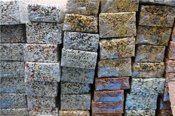 只见朱庆庭把熬好的糖油和原料拌均后,迅速把搅拌好了的料倒进一个木制的方框里,再用木滚桶把料压实,然后用一把特大的刀把料“沙沙”作响地切成条后再切成片就是冻米糖了。