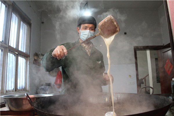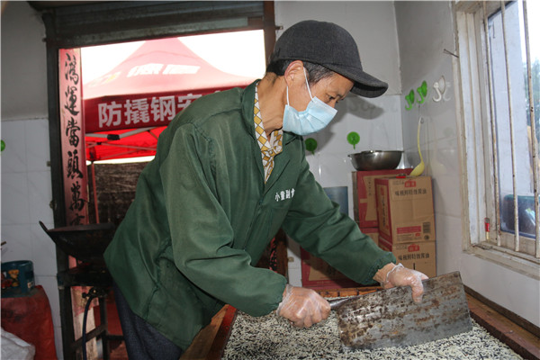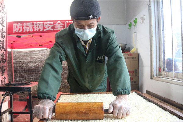 朱庆庭说,11月份以来,一天要切20多灶的冻米糖。而到春节前的个把月就更忙了,得请亲戚来帮忙。(王东方)