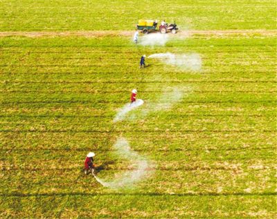 图为1月30日,农民在庐江县白湖镇农田进行小麦施肥、病虫害防治作业。