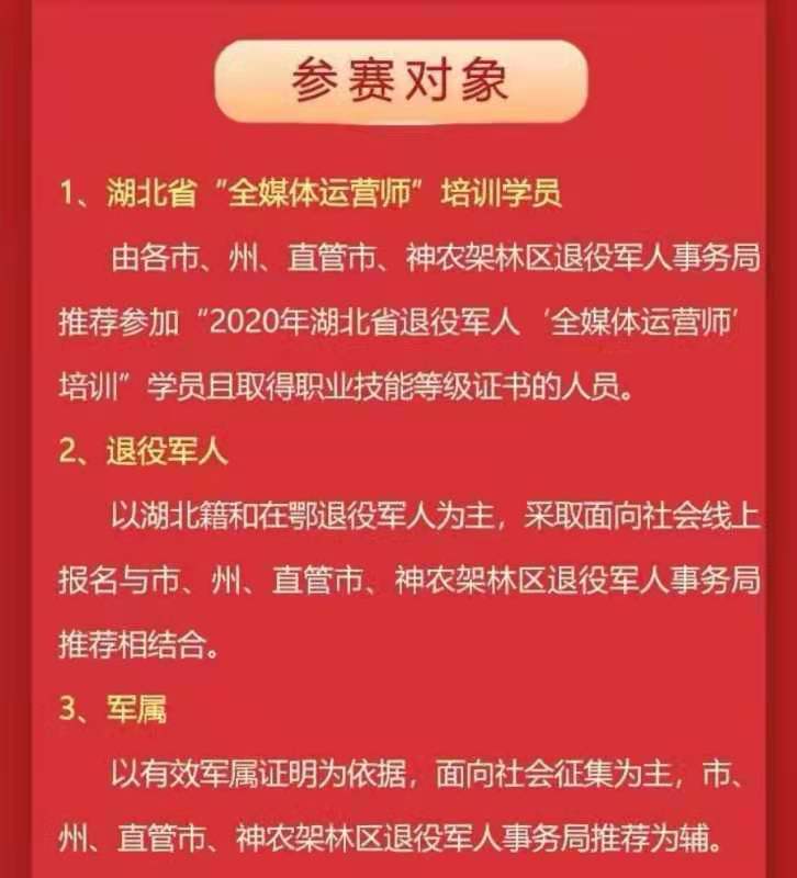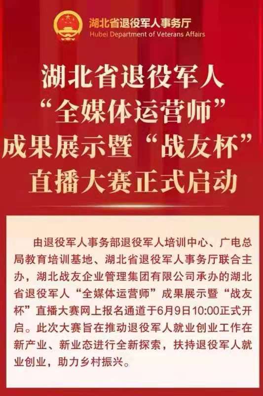 据了解,本次直播大赛主要面向2020年度湖北省退役军人“全媒体运营师”培训取得资质的学员1000名、湖北籍及在鄂工作的退役军人1000名和现役军人的军属、退役军人的军属1000名,以电台导师、网红导师、企业导师、创业导师为主的导师团,以战友团、亲友团、企业团、直播团为主的助力团,以授课、比赛、投票、带货为主同步赛,提升退役军人、军属创业就业创新创造精神,展现直播大赛塑造力。